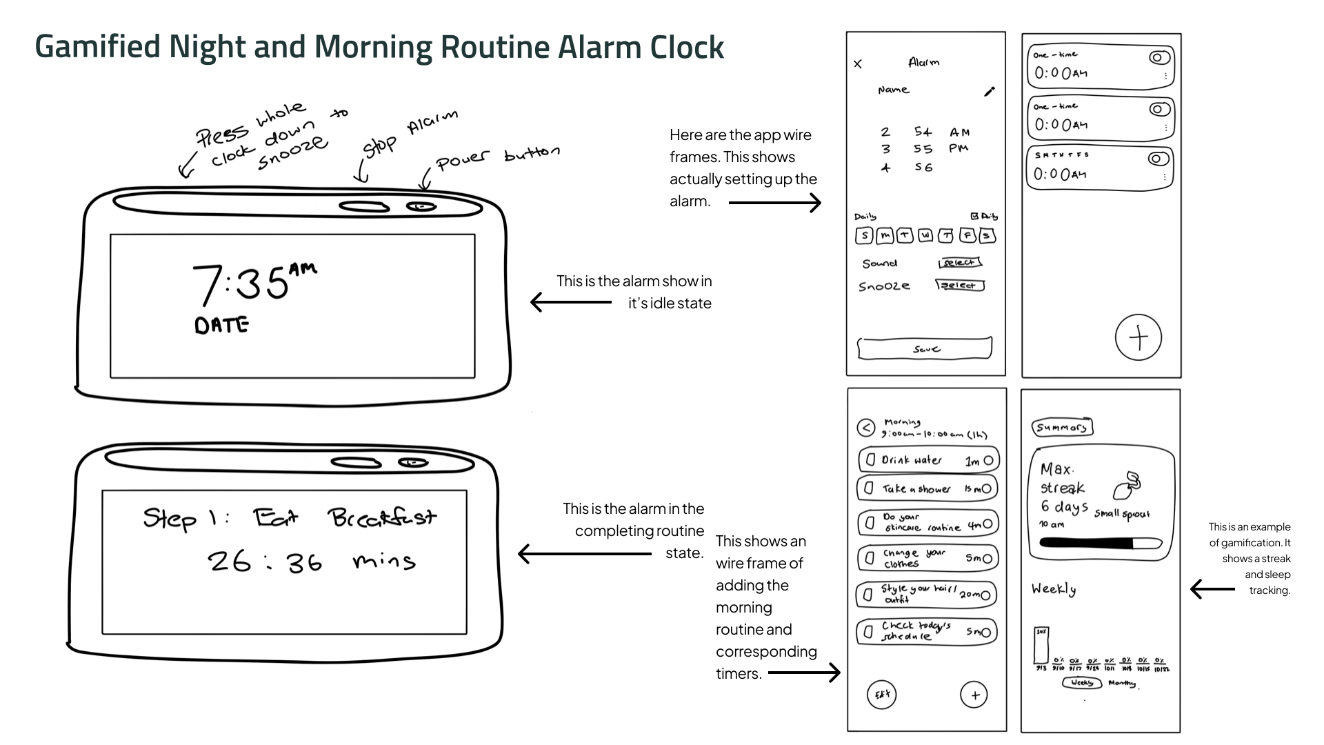 It is rooted in helping people create and keep morning and night routines. My concept is a gamified physical alarm clock.