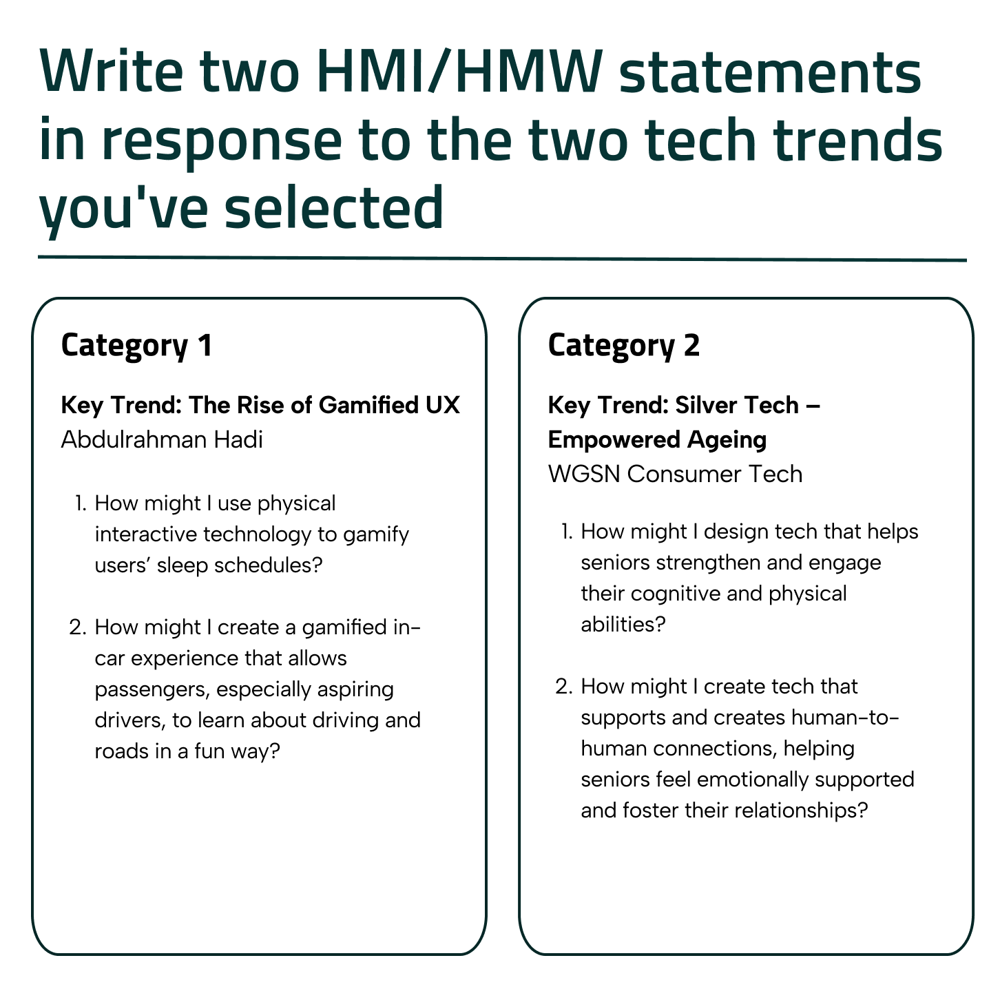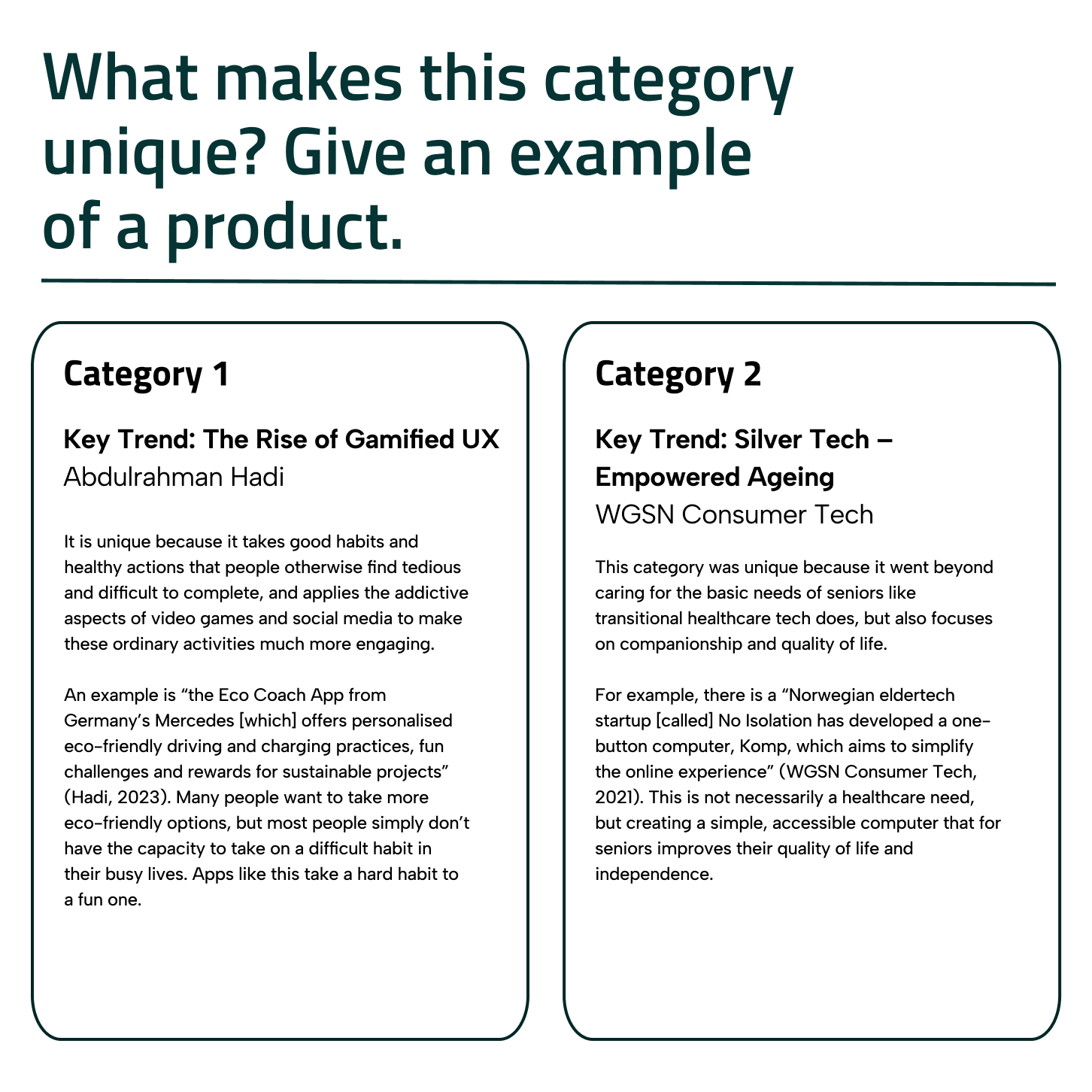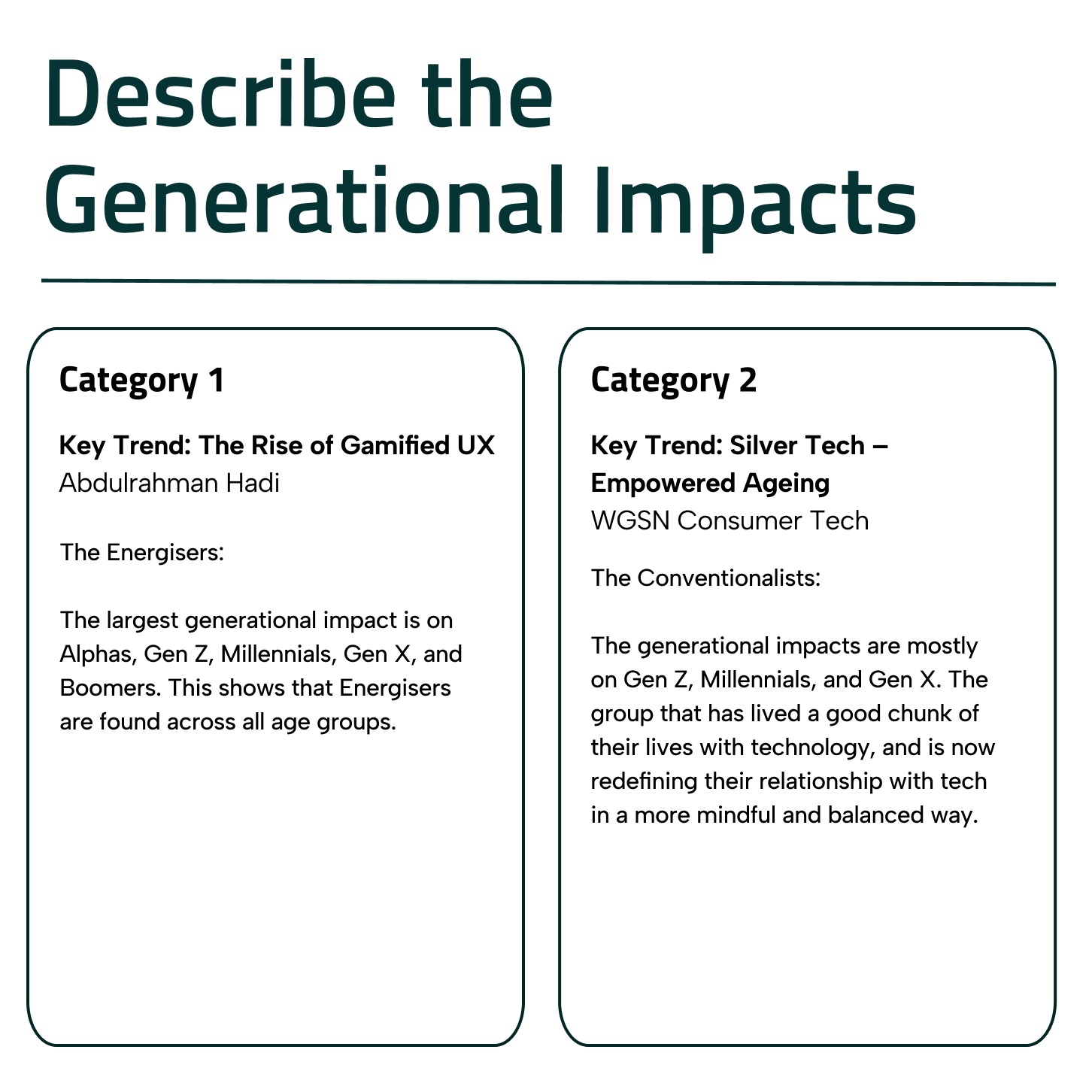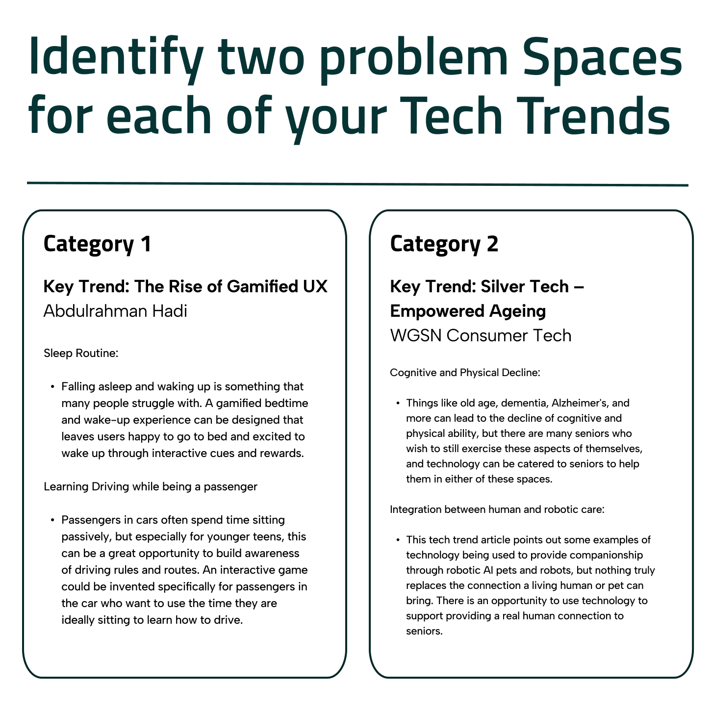 The two tech trends I focused on are gamified UX and Silver Tech. Gamified UX refers to turning everyday tasks into motivating, gamified experiences. Silver tech focuses on helping older adults live better, more independent lives as the global ageing population rapidly grows.