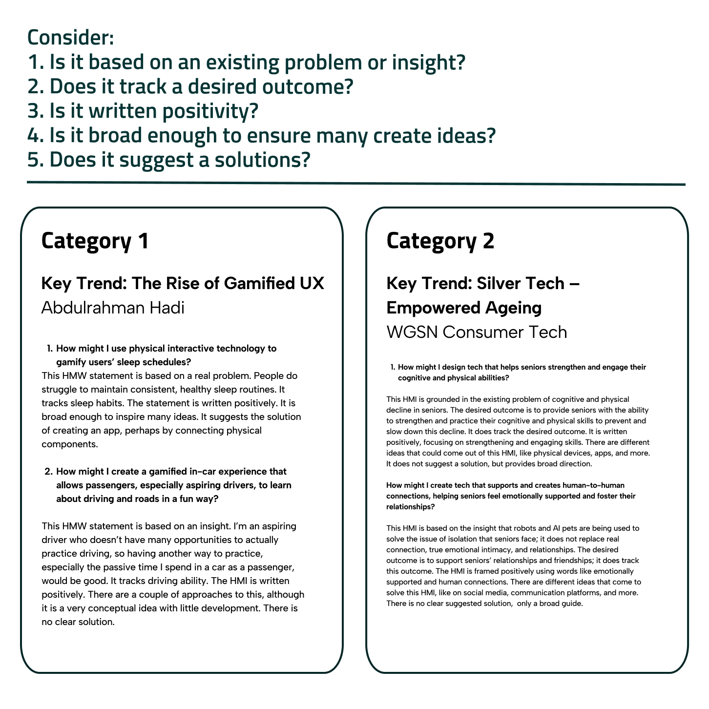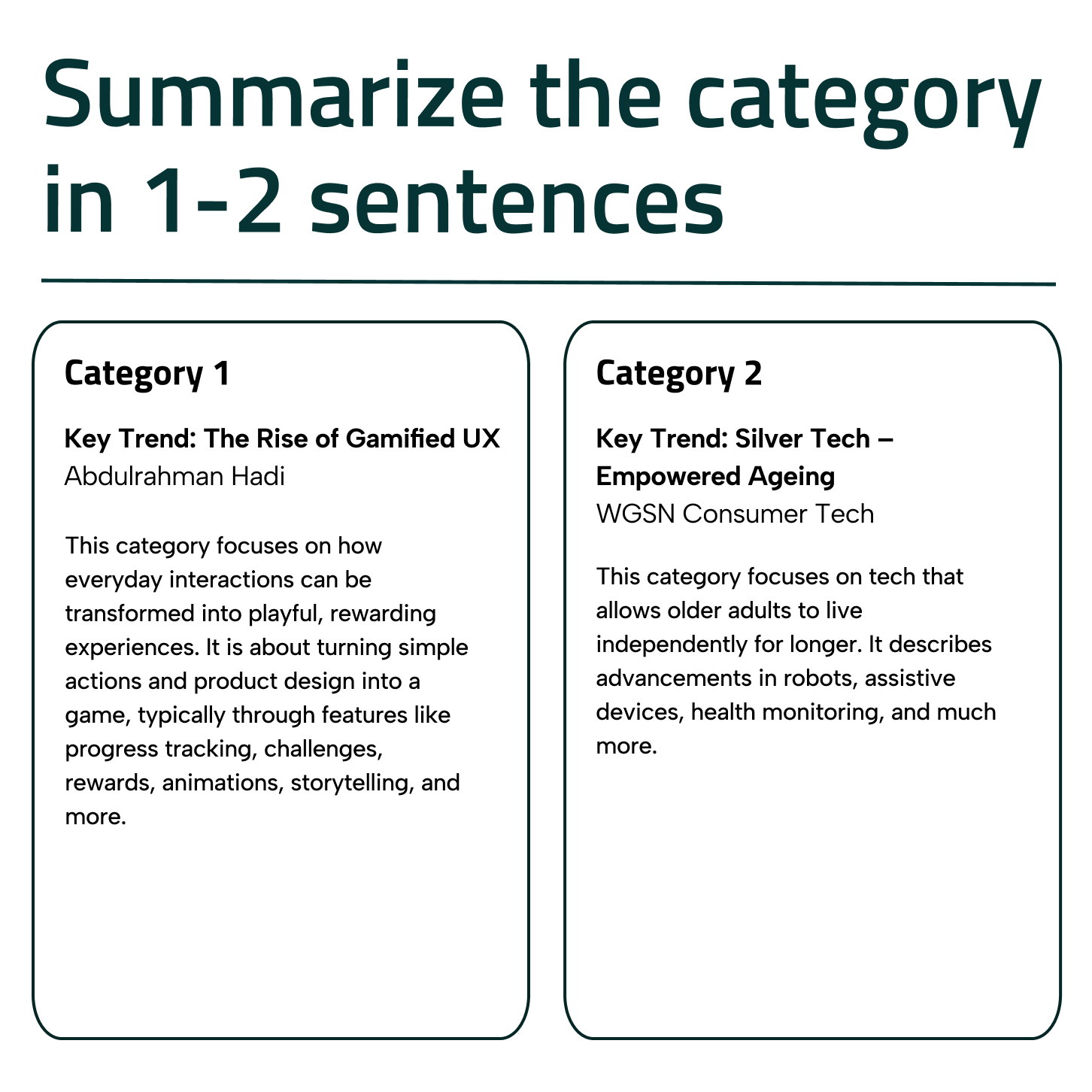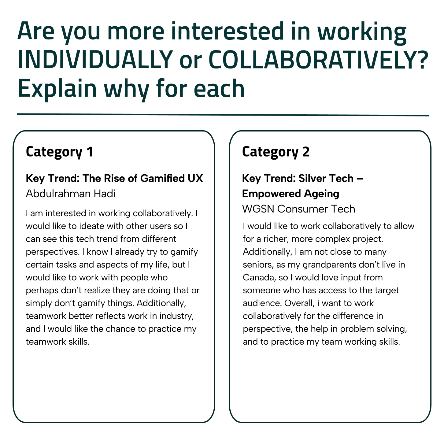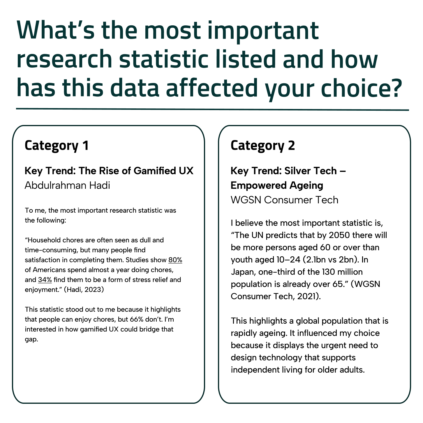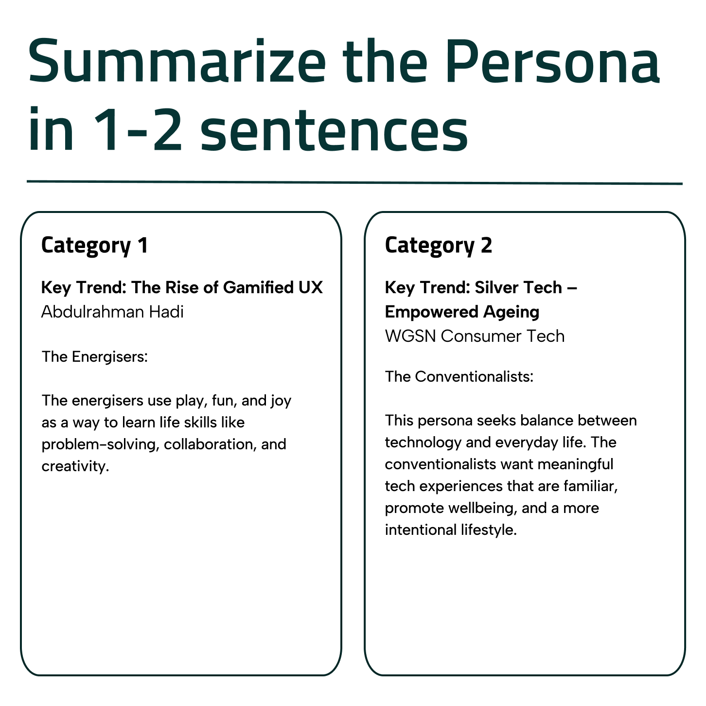 The two tech trends I focused on are gamified UX and Silver Tech. Gamified UX refers to turning everyday tasks into motivating, gamified experiences. Silver tech focuses on helping older adults live better, more independent lives as the global ageing population rapidly grows.