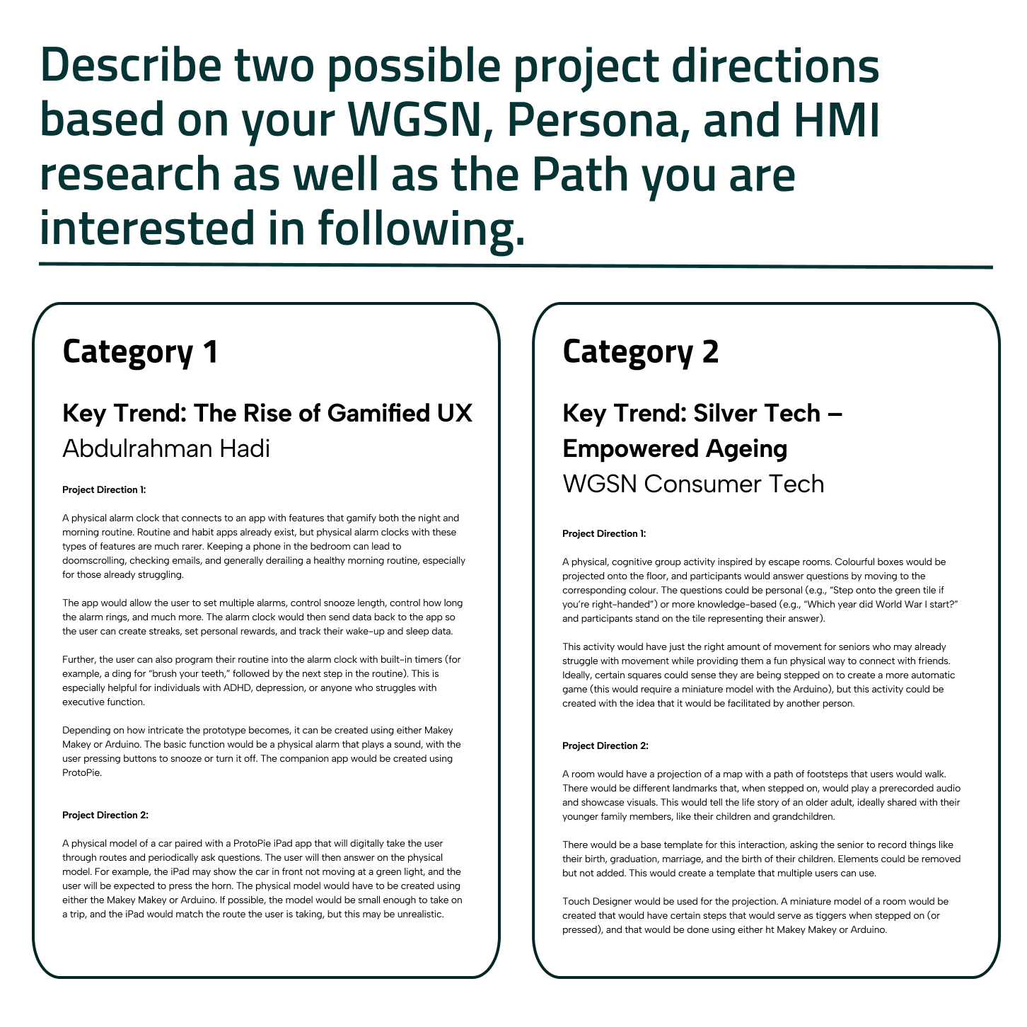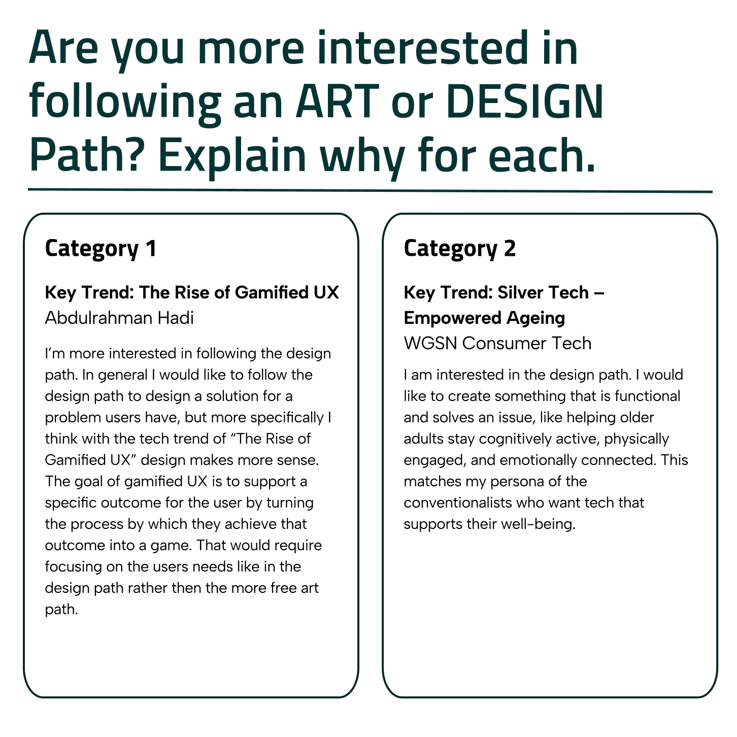 The research phase helped me conceptualize an idea for the rest of the semester, and I found it very helpful to explore WGSN. I was especially interested in the “Rise of Gamified UX” because the concept of making life more enjoyable and fun is something very meaningful to me. This was reinforced by learning about the Energisers persona, which showcases a group of people looking for their tech to be rewarding and playful. This research helped shape my final concept in the Design path.
